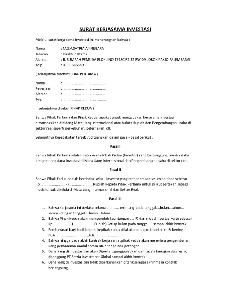 SURAT PERJANJIAN KERJASAMA INVESTASI. SURAT PERJANJIAN KERJASAMA INVESTASI Pada hari ini, Senin tanggal Dua Puluh Tujuh bulan Maret tahun Dua Ribu Delapan Belas (27–3–2018), yang bertanda tangan di bawah ini: 1. Nama : NIK : Pekerjaan : Umur : Alamat : Untuk selanjutnya disebut sebagai PIHAK PERTAMA.