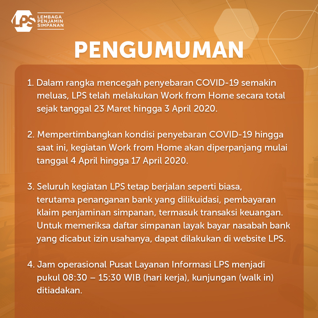 Lps Ri Idic Sur Twitter Sebelumnya Lps Telah Memberlakukan Work From Home Sejak Tanggal 23 Maret 3 April 2020 Namun Mempertimbangkan Kondisi Penyebaran Covid 19 Terkini Kegiatan Work From Home