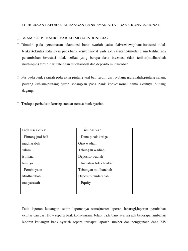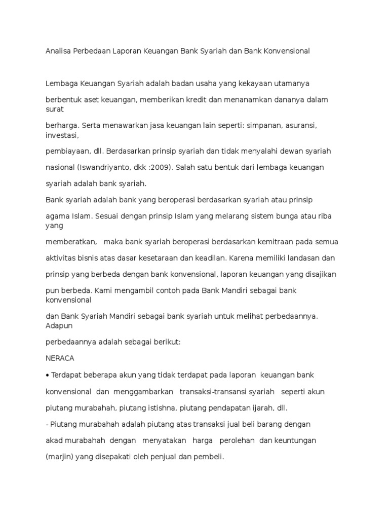 Analisis Laporan Keuangan Bank Konvensional Dan Bank Syariah. Abstract. Perkembangan perbankan di Indonesia sedang mengalami perkembangan yang sangat pesat, hal ini terbukti dari semakin banyaknya berdiri bank-bank di Indonesia. Saat ini di Indonesia telah hadir satu jenis perbankan yang memiliki prinsip yang berbeda dari perbankan-perbankan ...