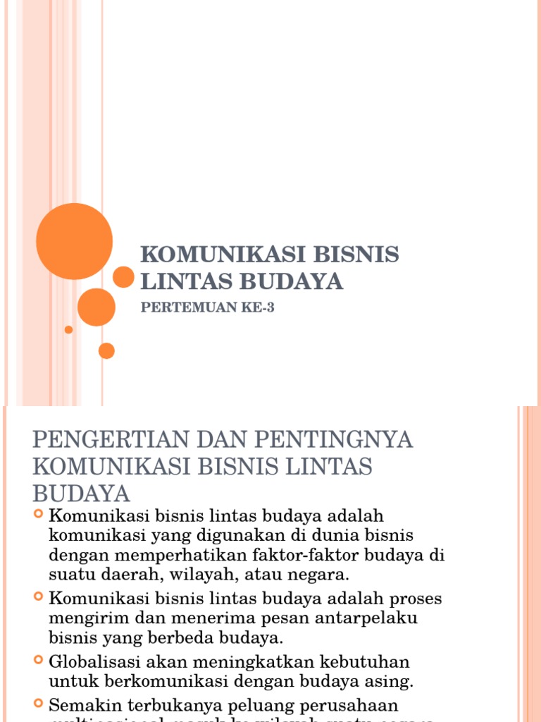 Komunikasi bisnis lintas budaya adalah komunikasi yang digunakan dalam dunia bisnis baik komunikasi verbal maupun nonverbal dengan memperhatikan faktor-faktor budaya di suatu daerah, wilayah, atau negara. Pengertian lintas budaya dalam hal ini bukanlah semata-mata budaya asing... Contoh kasus komunikasi bisnis lintas budaya Komunikasi Bisnis Lintas Budaya ialah suatu komunikasi yang diperlukan dalam dunia bisnis baik secara verbal maupun non verbal dengan mengamati faktor-faktor budaya yang terdapat disuatu daerah, wilayah atau negara. Perbedaan yang terdapat dalam setiap budaya selalu meliputi beberapa hal seperti: Norma-norma, nilai-nilai, simbol-simbol, bahasa ... KOMPAS.com - Komunikasi bisnis merupakan proses penyampaian dan penerimaan pesan dalam lingkup bisnis. Tujuan komunikasi bisnis secara umum adalah memberi informasi, mempersuasi, serta melakukan kolaborasi.. Sama seperti bentuk komunikasi lainnya, komunikasi bisnis bisa dilakukan secara verbal, baik lisan maupun tulisan, dan nonverbal.