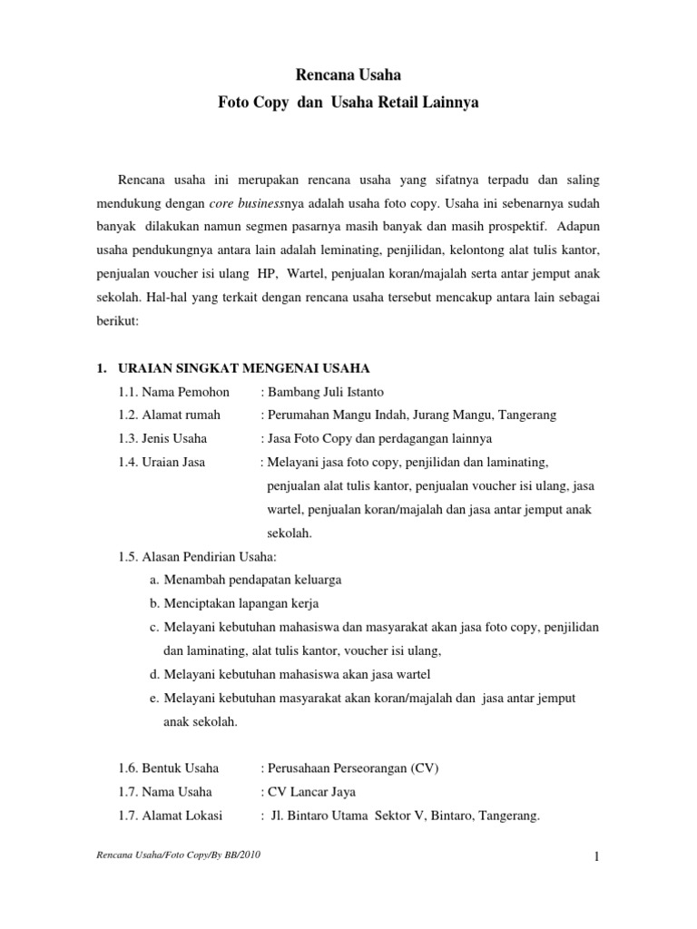 Tips Membuat Dan Contoh Proposal Bisnis Plan Akuratpost Tips Membuat Dan Contoh Proposal Bisnis Plan Akuratpost 3/8 [Book] Contoh proposal penelitian - Proposal merupakan karya ilmiah yang berisi rancangan penelitian secara terperinci dan lengkap, meliputi alasan, teori dan metode yang digunakan. Hampir semua ilmu pengetahuan harus melalui tahap penelitian. Oleh sebab itu, sebelum CONTOH PROPOSAL BUSINESS PLAN - Academia.edu CONTOH PROPOSAL BUSINESS PLAN. ... Download Download PDF. Full PDF Package Download Full PDF Package. This Paper. A short summary of this paper ... Beroperasi 6 Mengelola Usaha 7 Konsultasi Dan Laporan Bulanan 8 Laporan Akhir Kegiatan 9 Persiapan Pengembangan Bisnis Business Plan Jelly Hitz Halaman 11 BAB III PENUTUP Mendirikan suatu usaha ...