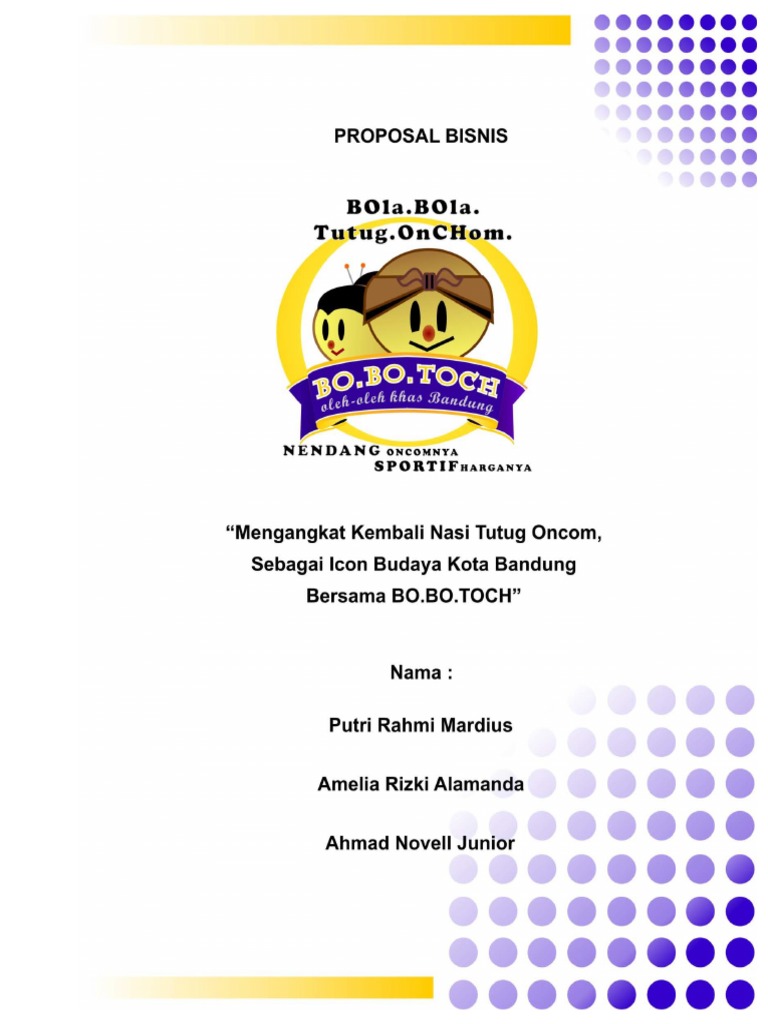 CONTOH PROPOSAL BUSINESS PLAN - Academia.edu NAMA : HILDA KURNIA SETIAJI NIM :30401411271 CONTOH PROPOSAL BUSINESS PLAN BAB I PENDAHULUAN Nama Perusahaan : Corp. Bidang Usaha : Produk Makanan Jenis Produk : Nugget Tahu Alamat Perusahaan : Jalan Pemuda I, Rawamangun-Jakarta Timur Nomor Telepon : 083895161xxx A. Identifikasi Peluang Bisnis Dewasa ini, bisnis kuliner menjadi salah satu bentuk bisnis yang menjanjikan.