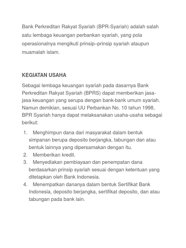 kegiatan yang tidak boleh dilakukan bank perkreditan rakyat maharanistynngbd maharanistynngbd. Usaha yang tidak boleh dilakukan Bank Perkreditan Rakyat (BPR) adalah : -Menerima simpanan berupa giro. -Melakukan kegiatan usaha dalam valuta asing. -Melakukan penyertaan modal dengan prinsip prudent banking dan concern terhadap layanan... Kegiatan bank perkreditan rakyat (BPR) Kegiatan-kegiatan pokok bank adalah : Dalam melaksanakan kegiatannya bank dibedakkan antara kegiatan. Bank umum dengan kegiatan bank perkreditan rakyat. Undang-undang perbankan tahun 1992 hanya membedakan dua macam bank, yaitu bank umum dan bank perkreditan rakyat. Bank Perkreditan Rakyat (BPR) Bank perkreditan rakyat adalah bank penunjang yang memiliki keterbatasan wilayah operasional dan dana yang dimiliki dengan layanan yang terbatas pula seperti memberikan kridit pinjaman dengan jumlah yang terbatas, menerima simpanan masyarakat umum, menyediakan pembiayaan dengan...