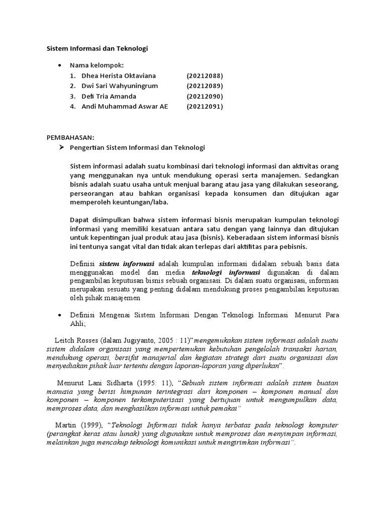 PDF Sistem Informasi dalam Bisnis - Indonesia Open University Sistem informasi sendiri didefinisikan sebagai suatu sistem yang digunakan untuk mengumpulkan, mengolah, menyimpan, dan mendistribusikan informasi (Laudon & Laudon, 2018). Informasi tersebut akan digunakan untuk mendukung tata kelola suatu organisasi. Sistem Informasi Manajemen: Pengertian, Fungsi, Jenis, Contoh Pengertian dari Sistem Informasi Manajemen Sistem informasi manajemen (SIM) adalah sekelompok atau sekumpulan proses dimana data dapat diolah, dianalisis, dan ditampilkan supaya data tersebut menjadi berguna untuk kebutuhan pengambilan suatu keputusan. Sistem Informasi Manajemen: Manfaat serta Contoh Penerapannya Baca juga: Sistem Produksi: Pengertian, Tujuan, dan Jenis-Jenisnya . Penerapan Sistem Informasi Manajemen pada Bisnis Enterprise Resource Planning (ERP) Biasanya, perusahaan besar sering menggunakan sistem informasi manajemen ERP. Namun, sistem ini juga dapat digunakan dalam skala kecil. Sistem Informasi: Pengertian, Tujuan, Fungsi, Komponen ... Menurut Ensiklopedia Britannica, sistem informasi didefinisikan sebagai seperangkat komponen yang terintegrasi dan bertugas untuk mengumpulkan, menyimpan, dan memproses data. Pemrosesan data ini tadi akan menghasilkan produk digital dan menyediakan informasi bagi bisnis atau organisasi dalam operasional mereka.