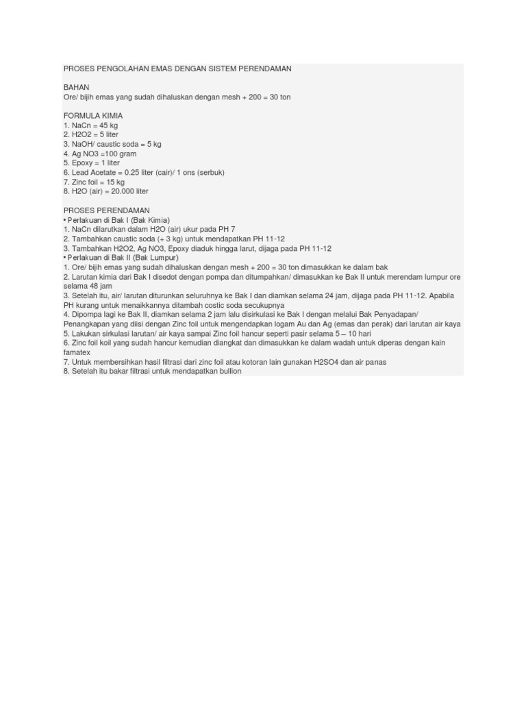 Pengolahan Emas Dengan Kimia - WordPress.com PENGOLAHAN EMAS SECARA SIANIDA Cara Kerja 1. Bahan berupa batuan dihaluskan dengan menggunakan alat grinding sehingga menjadi tepung (mesh + 200). 2. Bahan di masukkan ke dalam tangki bahan, kemudian tambahkan H2O (2/3 dari bahan). 3. Tambahkan Tohor (Kapur) hingga pH mencapai 10,2 - 10,5 dan kemudian tambahkan Nitrate (PbNO3) 0,05 %. 4.