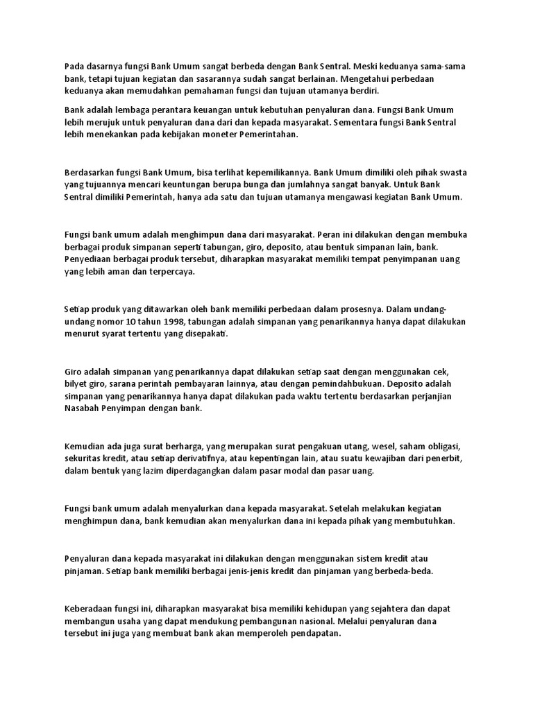 3 Fungsi dan Tugas Bank Umum yang Harus Anda Tahu Bank umum juga bisa di sebut sebagai bank komersial (commercial bank). Pengertian dari bank umum sendiri adalah sebuah badan usaha perbankan yang menjalankan tugasnya Tentunya setiap fungsi dan tugas ini masih di bawah pengawasan Bank Indonesia (BI) selaku Bank Sentral Indonesia. Perbedaan Kegiatan Bank Sentral dan Bank Umum Adalah Bank Umum adalah bank yang melaksanakan kegiatan usaha secara konvensional dan atau berdasarkan prinsip Syariah yang dalam kegiatannya memberikan jasa dalam lalu lintas pembayaran. Sementara itu Bank Sentral adalah pelaksana dari kebijaksanaan moneter pemerintah yang... (DOC) Perbedaan Bank Umum dan Bank Central - Academia.edu Contoh Bank Sentral : Bank Indonesia 1.1.2 BANK UMUM Menurut pasal 3 ayat 1 butir b, Bank Umum ialah bank yang dalam pengumpulan dananya terutama menerima simpanan dalam bentuk giro dan deposito dan dalam usahanya terutama memberikan kredit jangka pendek. 14 Perbedaan Bank Sentral dan Bank Umum... - DosenEkonomi.com Sistem perbankan di Indonesia meliputi Bank Indonesia sebagai bank sentral, bank umum, bank perkreditan rakyat, dan bank bagi hasil. Pada kesempatan kali ini, pembahasan akan difokuskan pada perbedaan bank sentral dan bank umum, seperti berikut