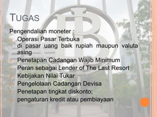 3 Tugas Bank Indonesia (BI) Sebagai Bank Sentral ... Adapun tugas Bank Indonesia (BI) sebagai bank sentral Indonesia adalah: Menetapkan dan Melaksanakan Kebijakan Moneter Guna menjaga sistem perekonomian di Indonesia tetap stabil maka dibuatlah sebuah kebijakan moneter. Kebijakan moneter sendiri berfungsi untuk menjaga atau mengendalikan jumlah uang yang tersebar di masyarakat tetap stabil.