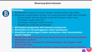 23 Identifikasikan Wewenang Bank Indonesia Dalam Rangka ... Mengatur dan menjaga kelancaran pada sistem pembayaran. Menetapkan dan melaksanakan kebijakan moneter dalam hal ini bank indonesia memiliki wewenang untuk menetapkan atau memperhatikan sasaran laju inflasi pengendalian moneter di luar operasi pasar terbuka dan menetapkan tingkat diskonto menetapkan cadangan minimum dan mengatur kredit atau pembiayaan.