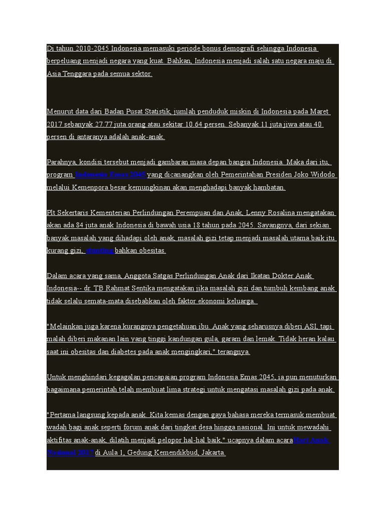 Contoh ESSAY ( Generasi Emas ) ~ kongsara Indonesia menuju 2045 sangatlah harus diperhatikan oleh siapa pun yang ada di Indonesia saat ini khususnya para pemuda bangsa. Ditahun itulah Indonesia akan merayakan 100 tahun kemerdekaannya. Kemerdekaan yang didapat dengan usaha yang tidak dapat kita balaskan sebagai penerus bangsa. Ini Penghambat Target Indonesia Emas 2045 - Suara Maka dari itu, program Indonesia Emas 2045 yang dicanangkan oleh Pemerintahan Presiden Joko Widodo melalui Kemenpora besar kemungkinan akan menghadapi banyak hambatan. Plt Sekertaris Kementerian Perlindungan Perempuan dan Anak, Lenny Rosalina mengatakan akan ada 84 juta anak Indonesia di bawah usia 18 tahun pada 2045. apa yang dimaksud indonesia emas 2045 - Brainly.co.id INDONESIA EMAS 2045 adalah visi pemerintah dalam memandang kesejahteraan bangsa Indonesia tepat di usianya yang ke 100 (1945-2045). Dalam usia emas tersebut, Indonesia dicanangkan menjadi Negara maju yang mandiri dengan kehidupan yang makmur juga adil. 🎉[Coming Soon Seminar Nasional Ssc 2018]🎉 Visi Indonesia Emas 2045: "Indonesia Emas 2045 adalah sebuah impian besar tentang Indonesia yang unggul, maju bersaing dengan bangsa-bangsa lain, dan telah cukup dewasa untuk mengatasi isu-isu persoalan klasik bangsa, seperti korupsi, isu disintegrasi, dan kemiskikan".