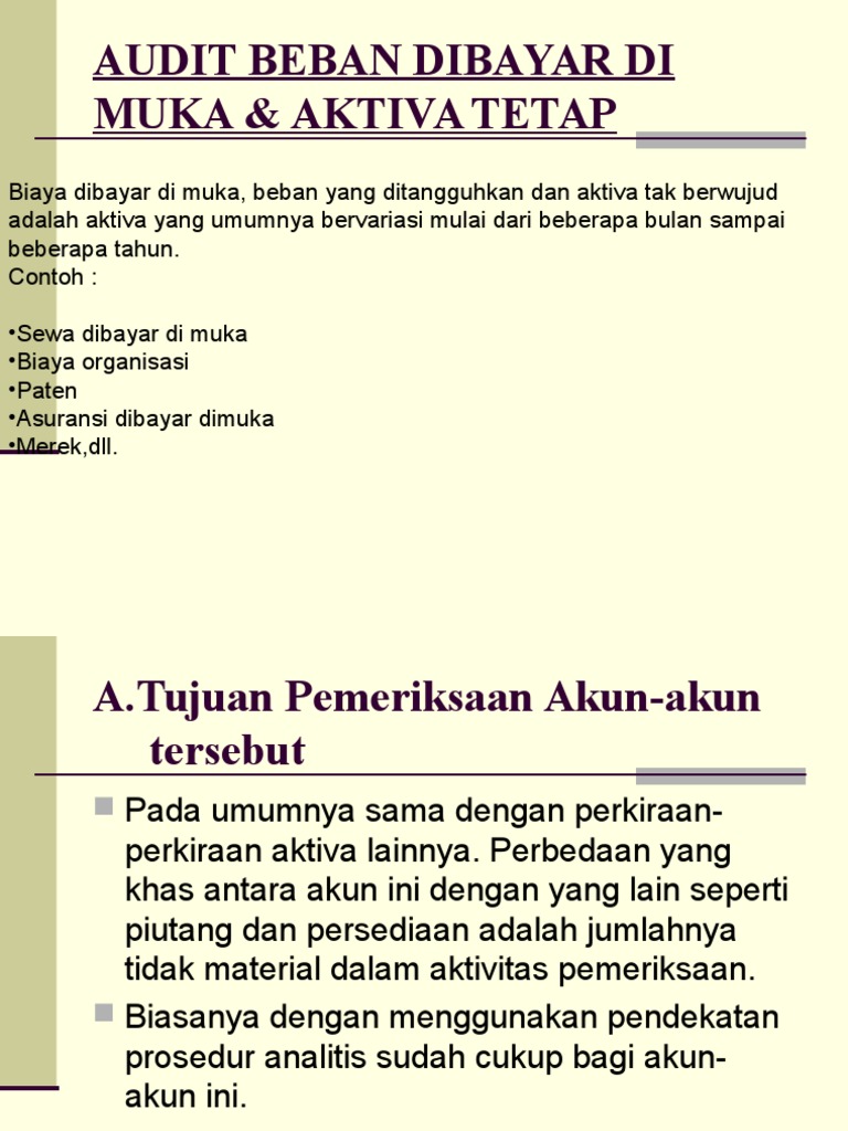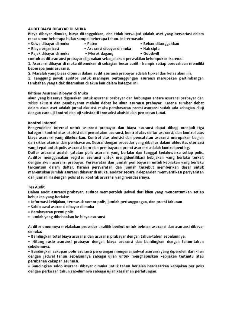 395872296-Audit-Biaya-Dibayar-Di-Muka.docx - AUDIT BIAYA ... AUDIT BIAYA DIBAYAR DI MUKA Biaya dibayar dimuka, biaya ditangguhkan, dan tidak berwujud adalah aset yang bervariasi dalam masa umur beberapa bulan sampai beberapa tahun. Ini termasuk: • Sewa dibayar di muka • Paten • Beban ditangguhkan • Biaya organisasi • Asuransi dibayar di muka • Hak cipta • Pajak dibayar di muka • Merek dagang • Goodwill contoh audit asuransi prabayar ...
