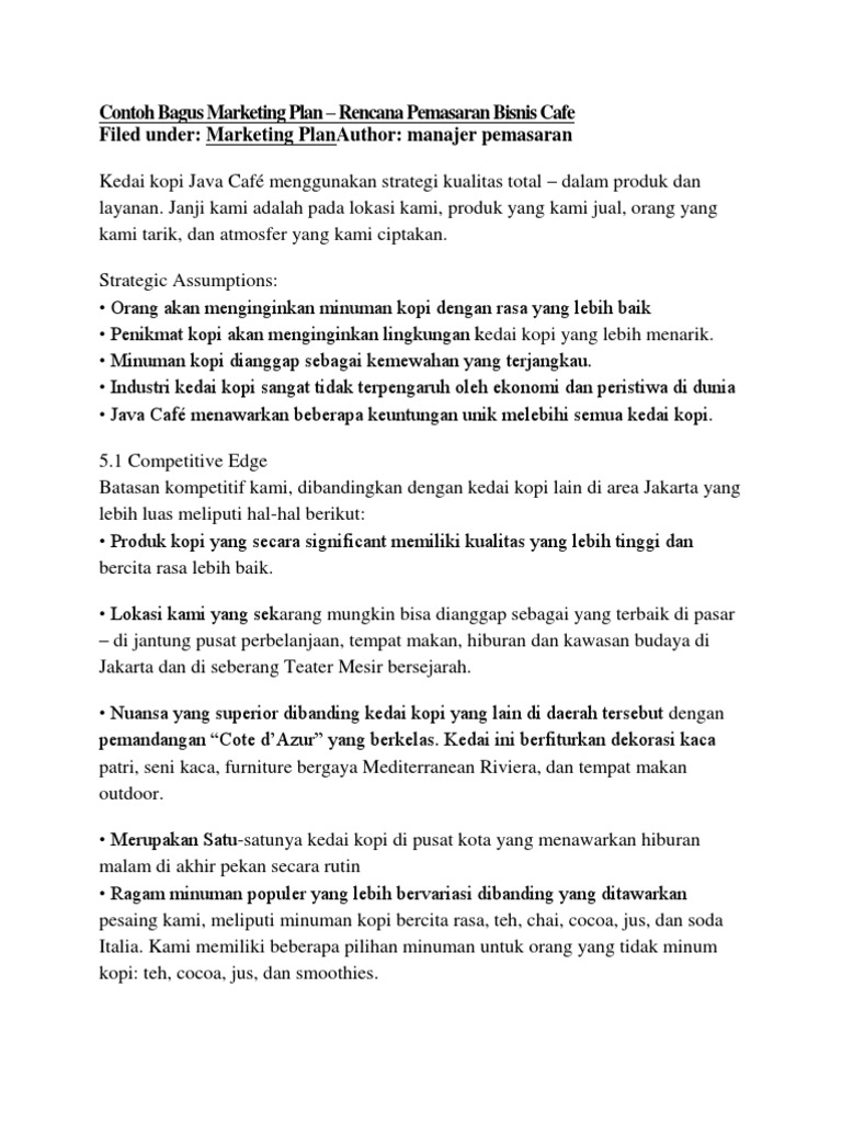 Contoh Rencana Bisnis - Business Plan Kedai Kopi Cafe Shop ... Contoh Rencana Bisnis - Business Plan Kedai Kopi Cafe Shop. Terimakasih terutama pada Starbucks, dalam kurun waktu 20 tahun terakhir kedai kopi telah akrab dalam kehidupan orang Amerika. Setiap hari, jutaan warga Amerika mampir untuk secangkir kopi berbahan espresso. Orang yang tidak akan bermimpi menghabiskan lebih dari 50 sen untuk ...