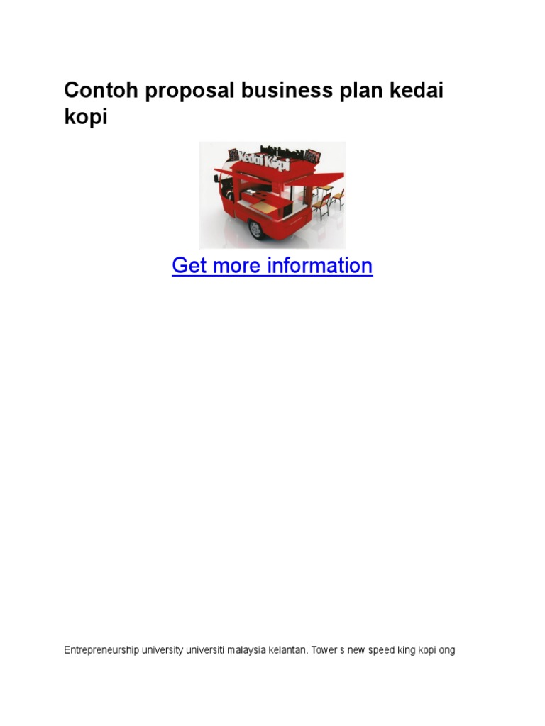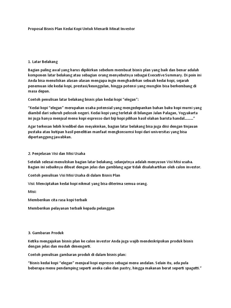 Contoh Proposal Bisnis Plan Kopi Contoh bisnis plan mengajak anda mempersiapkan exit strategy atau rencana kalau kedai kopi gulung tikar. Dengan menuliskan bisnis plan salah satunya untuk mengetahui progres bisnis dan rencana yang sudah terealisasi. Contoh Bisnis Plan Cafe Bagi setiap orang yang hendak menjalakan bisnis cafe tentu membutuhkan contoh proposal bisnis plan cafe.