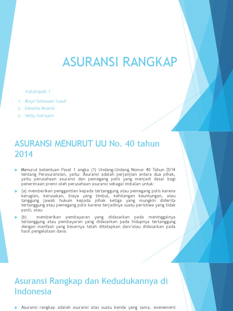 UU Asuransi No. 40 Tahun 2014 dan Bedanya dengan yang Lama UU Asuransi adalah dasar hukum yang mengatur kegiatan perasuransian. Landasan hukum asuransi di Indonesia diatur oleh Undang-undang Republik Indonesia Nomor. 40 Tahun 2014 tentang Perasuransian. Keberadaan undang-undang ini bertujuan untuk memberikan kejelasan tanggung jawab dan melindungi hak-hak masyarakat (khususnya nasabah).
